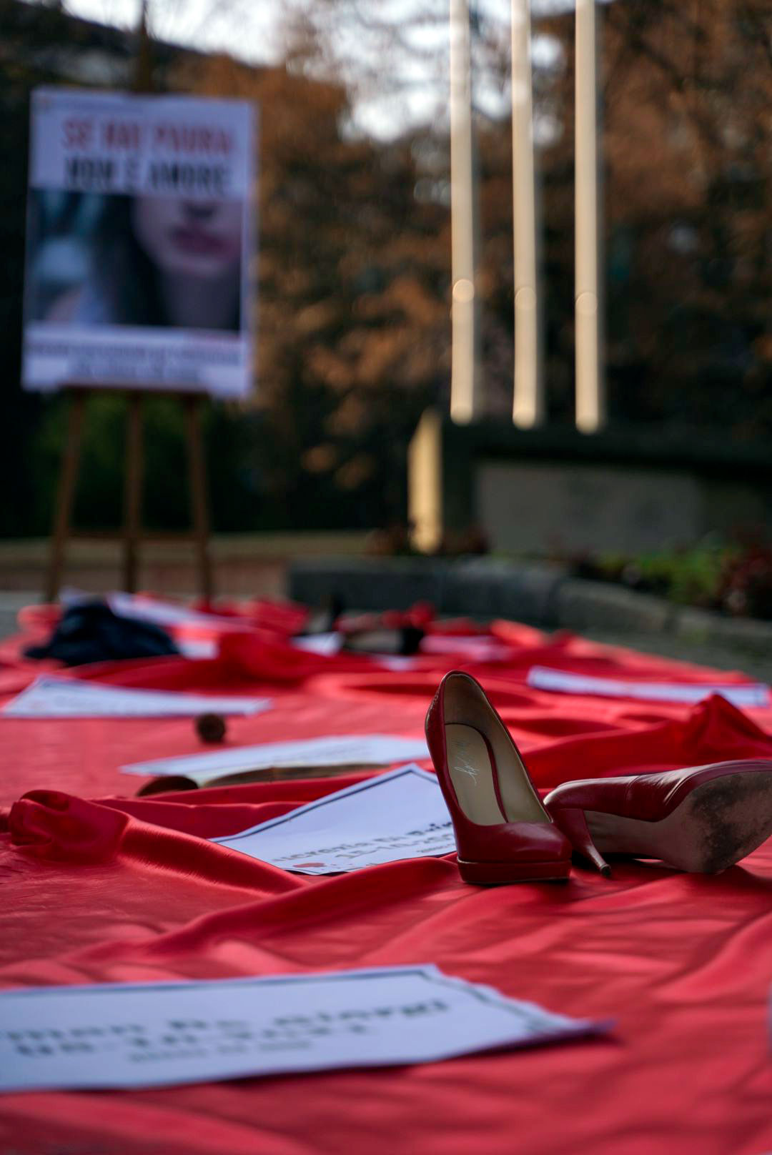 Una lunga striscia rossa piena di epigrafi di tutti i femminicidi da gennaio 2021 fino ad oggi. Troppe donne, troppe vite spezzate, troppi orrori da ricordare.