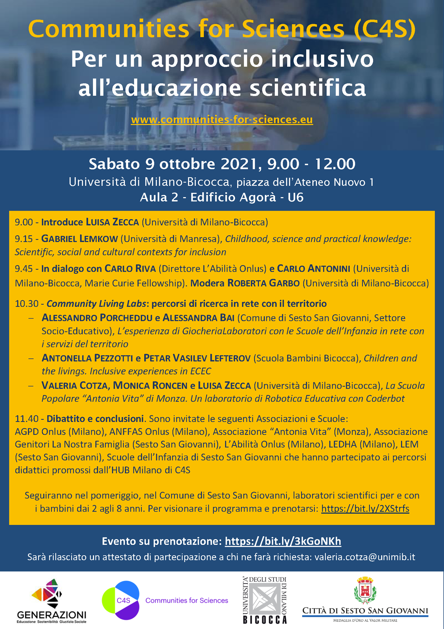 Communities for sciences (C4S) vuole raggiungere bambini, giovani, famiglie di comunità vulnerabili per coinvolgerli in proposte di attività sui temi dell’apprendimento scientifico, utilizzando modalità che permettano loro di porsi come attori sociali positivi, visibili e rilevanti all’interno del territorio. Per fare questo è stato creato un gruppo interdisciplinare e internazionale di partner e sostenitori, a cui sono state assegnate diverse comunità con cui lavorare, a seconda del loro contesto o della loro esperienza. Anche GiocheriaLaboratori e l’Università Milano Bicocca fanno parte di questo gruppo e mettono a diposizione tutta la competenza e l’esperienza maturata in anni di attività educative, laboratoriali e di ricerca per realizzare attività scientifiche per bambini e ragazzi con disabilità.