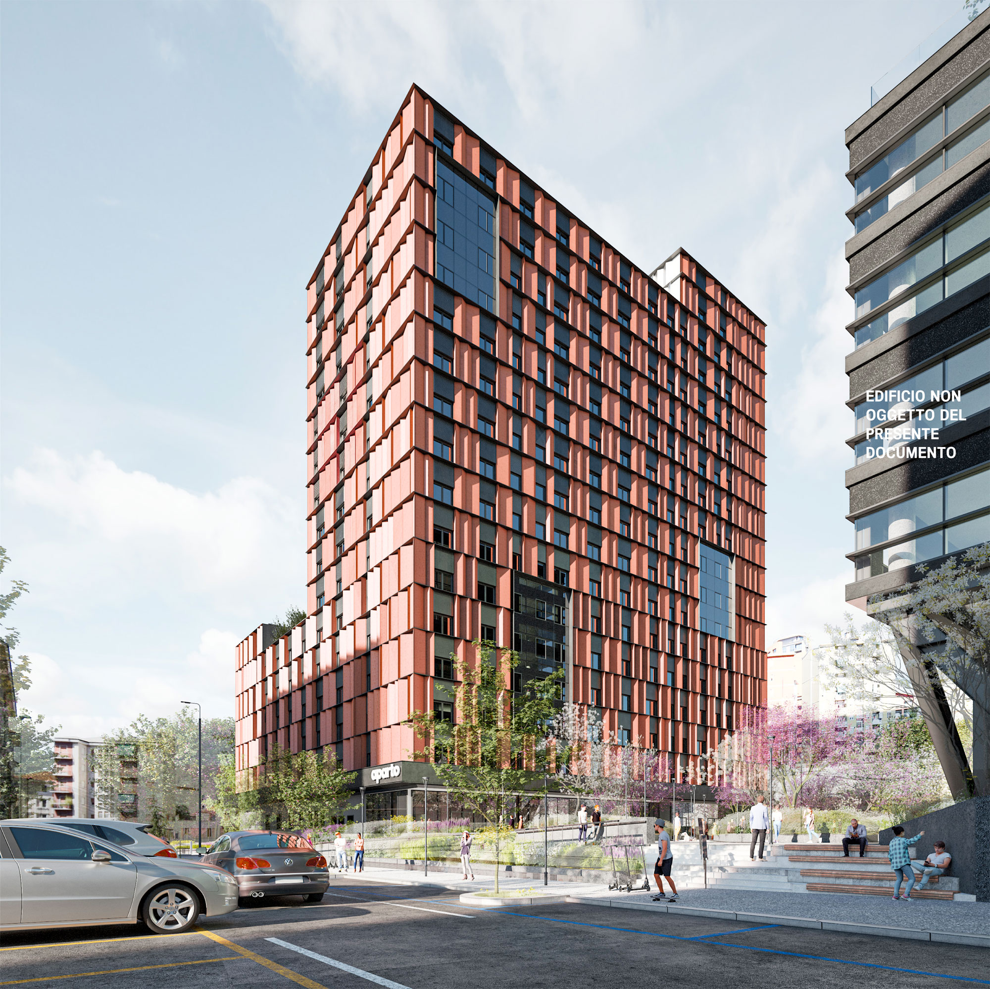 La piazza dello Studentato è il tassello conclusivo del nuovo sistema di piazze che diventerà luogo di ritrovo e socializzazione per gli utenti dello Studentato e per gli abitanti del quartiere, insieme ai nuovi negozi adiacenti.