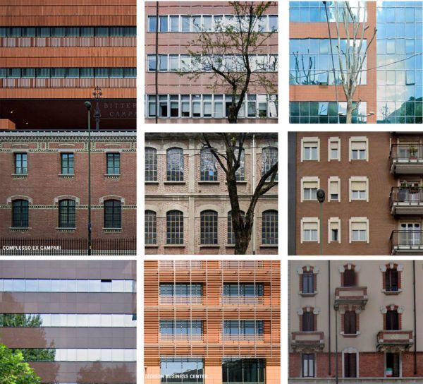 Note d’architettura: la struttura e i materiali di cucitura con gli edifici attorno e l’area industriale