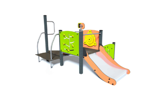 - una struttura multifunzione inclusiva in acciaio con scivolo e pannelli per attività ludiche