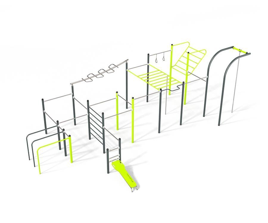- una torre attrezzata in acciaio con due scivoli, una parete di arrampicata inclinata, una parete di arrampicata verticale, due ponticelli, una sartia e pannelli per attività ludiche
