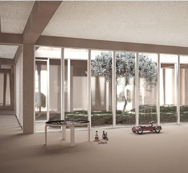 - In mezzo all’asilo c’è il patio, un CORTILE INTERNO con piante, fiori, pietre e tanto verde. Grazie alle sue pareti trasparenti, i bambini e le bambine, dall’interno dell’asilo, possono sempre vedere le piante, con i loro cambiamenti stagionali, e percepire lo scorrere del tempo con il variare della luce esterna.