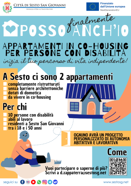 Il Comune di Sesto ha ottenuto un finanziamento dal PNRR (all’interno della Missione 5 “Inclusione e coesione” – Componente 2 – Investimento 1.2) per realizzare un progetto che favorisca l’autonomia abitativa e lavorativa delle persone con disabilità. In particolare, lo scopo è quello di sostenerle nell’affrontare un percorso che le porti ad acquisire la capacità di abitare in appartamenti attrezzati e di frequentare attività formative e tirocini lavorativi. Gli appartamenti messi a disposizione dal Comune saranno adeguatamente attrezzati, e saranno abitati da più persone (non sono previsti appartamenti singoli).