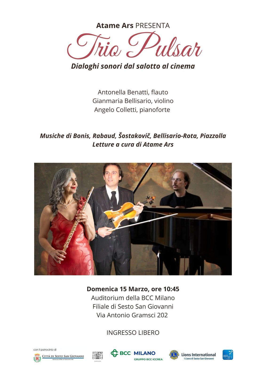 Un viaggio musicale in cui il trio Pulsar (flauto Antonella Benatti, violino Gianmaria Bellisario, pianoforte Angelo Coletti) attraversa il confine tra musica colta ed immaginario cinematografico.