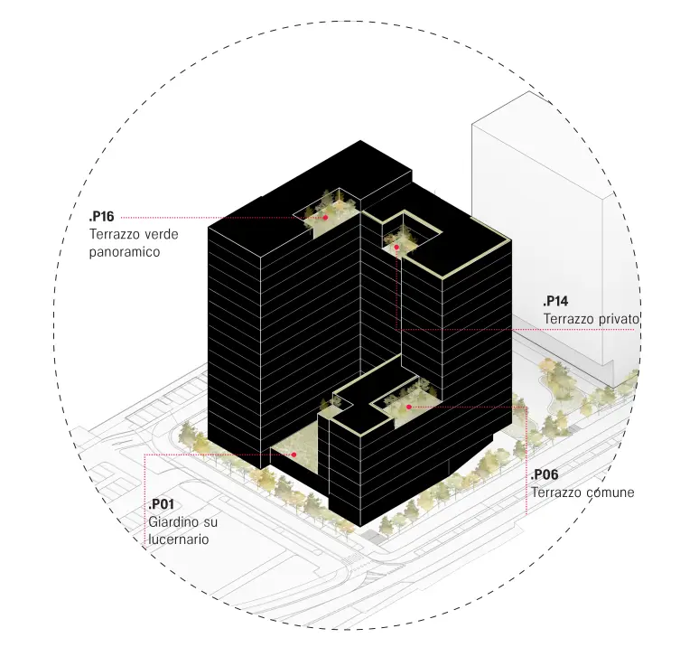 In cima alle torri e al podio sono presenti terrazze verdi panoramiche.