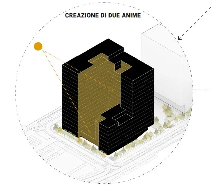 Le torri si affacciano sulla ampia corte e il loro posizionamento a L ottimizza l’esposizione solare ed evita l'ombreggiamento reciproco. Al centro della corte trova spazio il podio e il cuore di tutto il progetto: il lucernario centrale. Vera e propria lanterna visibile anche dai piani superiori, ha una duplice natura: scenografia di luce e volumi per lo spazio interno sottostante e giardino minerale all'affaccio dai piani superiori.
