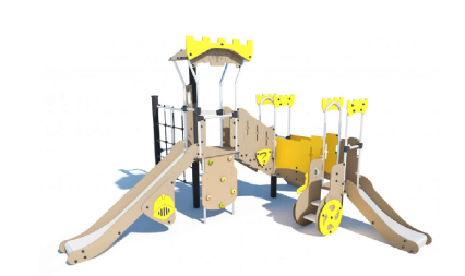 - una torre attrezzata in acciaio con due scivoli, una parete di arrampicata inclinata, una parete di arrampicata verticale, due ponticelli, una sartia e pannelli per attività ludiche
